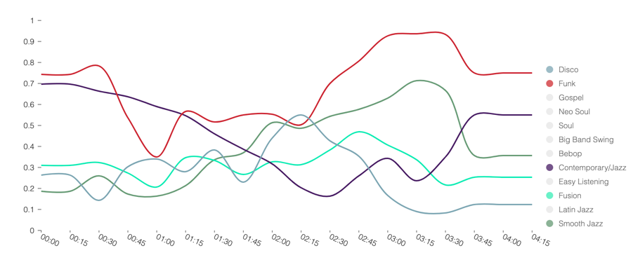 The third way to classify my music is to have an AI tool analyze my tracks and tell us what it thinks. Well, here are three, what I call, genre-grams that show it’s categorization of each track over the duration of the track.
